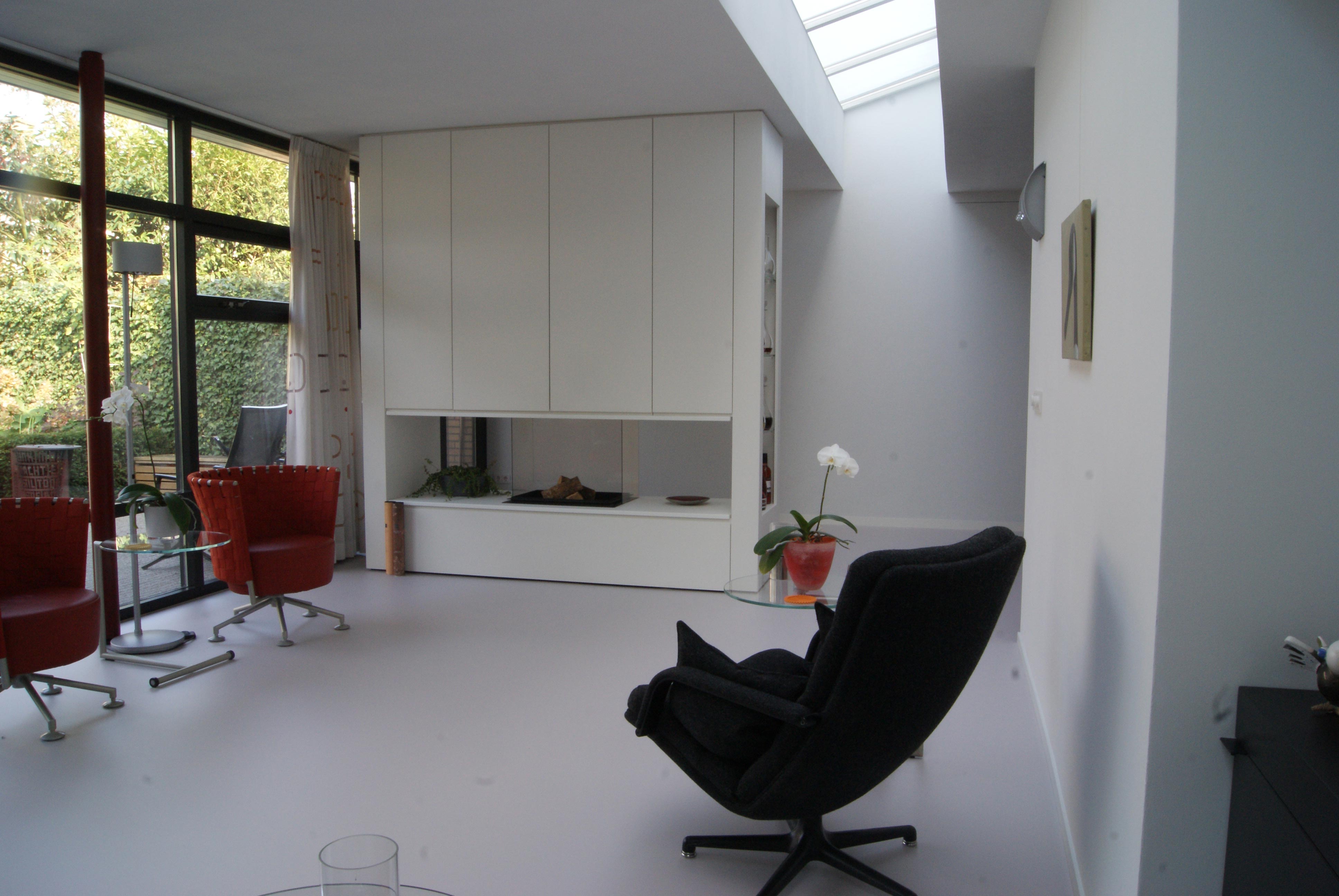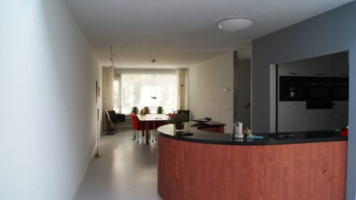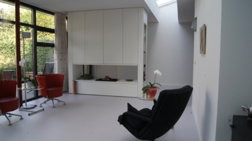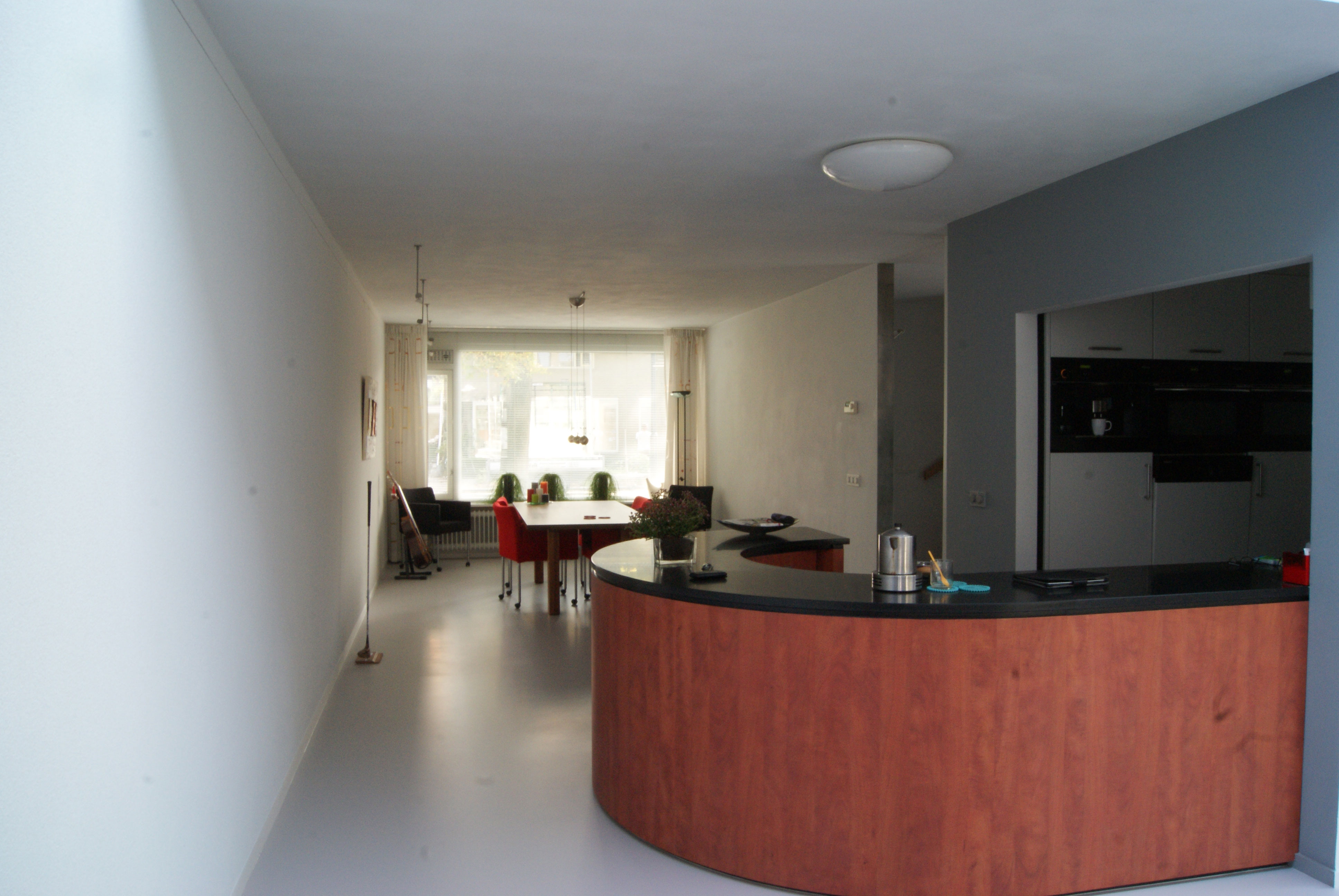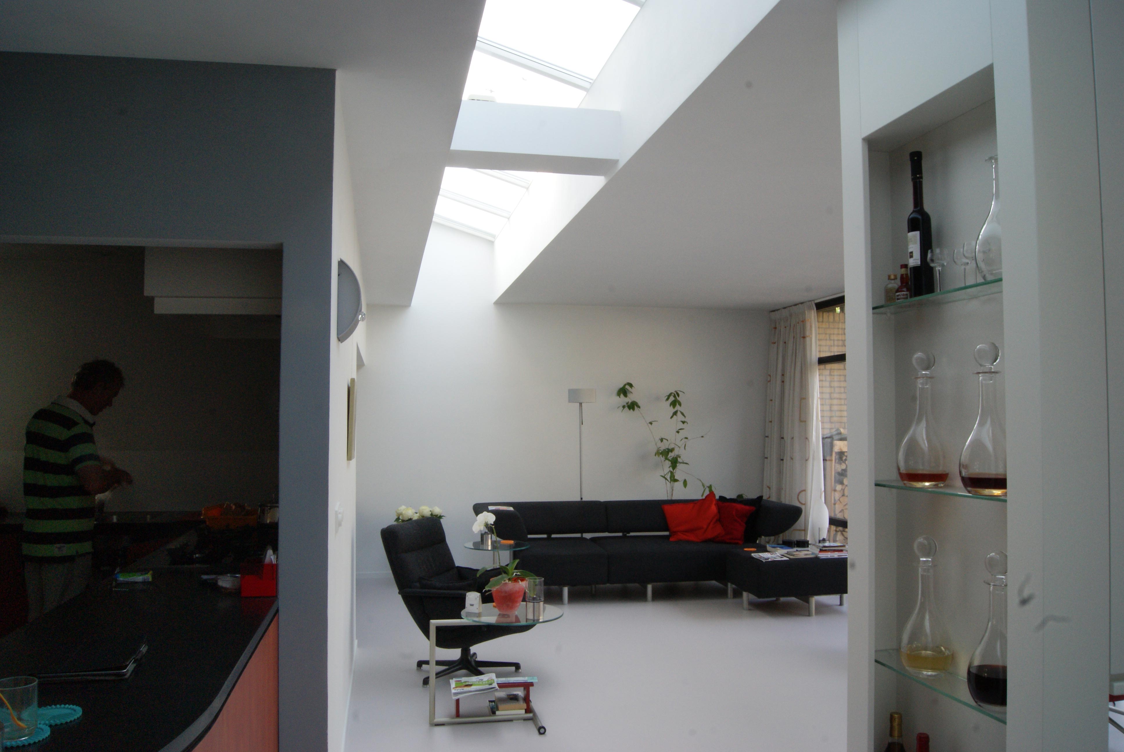 Het betreft hier de verbouwing van een woning uit 1970, een woning opgedeeld in een woon- en servicebeuk. De bestaande garage is gesloopt en bij de woning getrokken. Aan de achterzijde is de woning vergroot met een zitkamer. De entree met garderobe, toilet en keuken is dwarsgeplaatst en vormt zodoende een duidelijke scheiding in de orientatie. De eetkamer met zicht op de voorzijde, de straat en de zitkamer met zicht op de tuin.