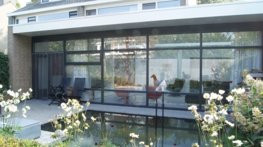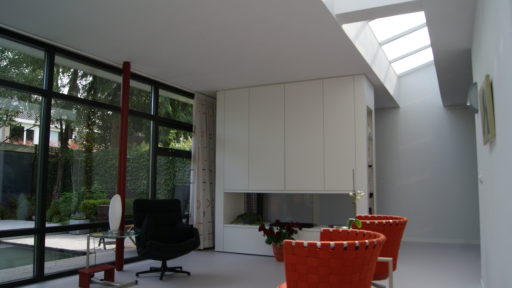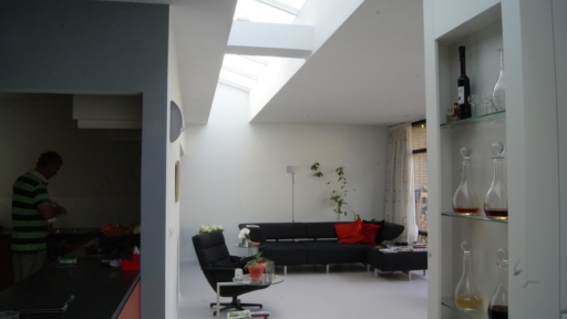 De uitbreiding aan de achterzijde is dmv. een lichtstraat los gehouden van de bestaande opgaande gevel.