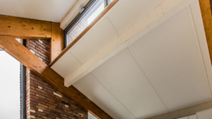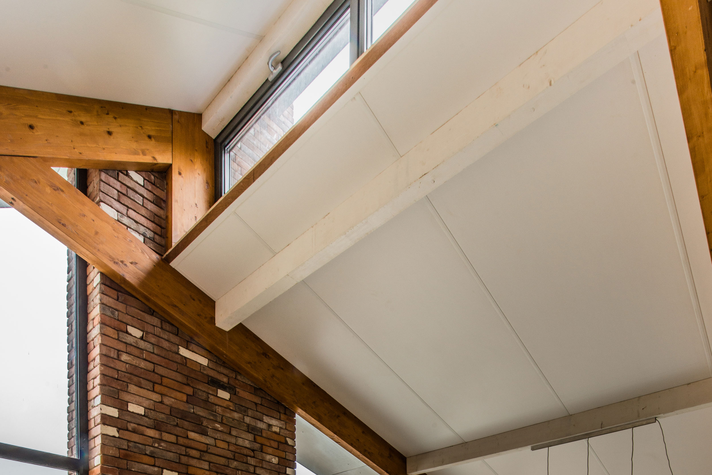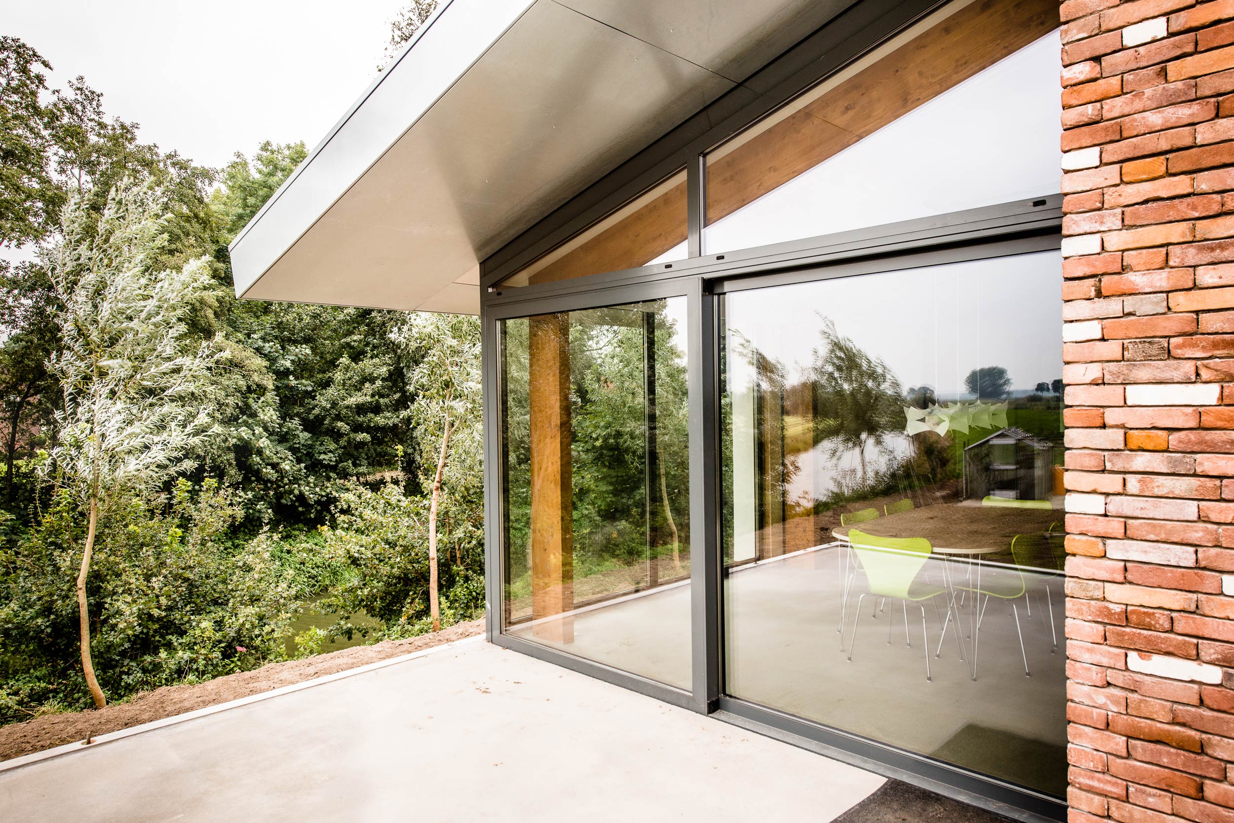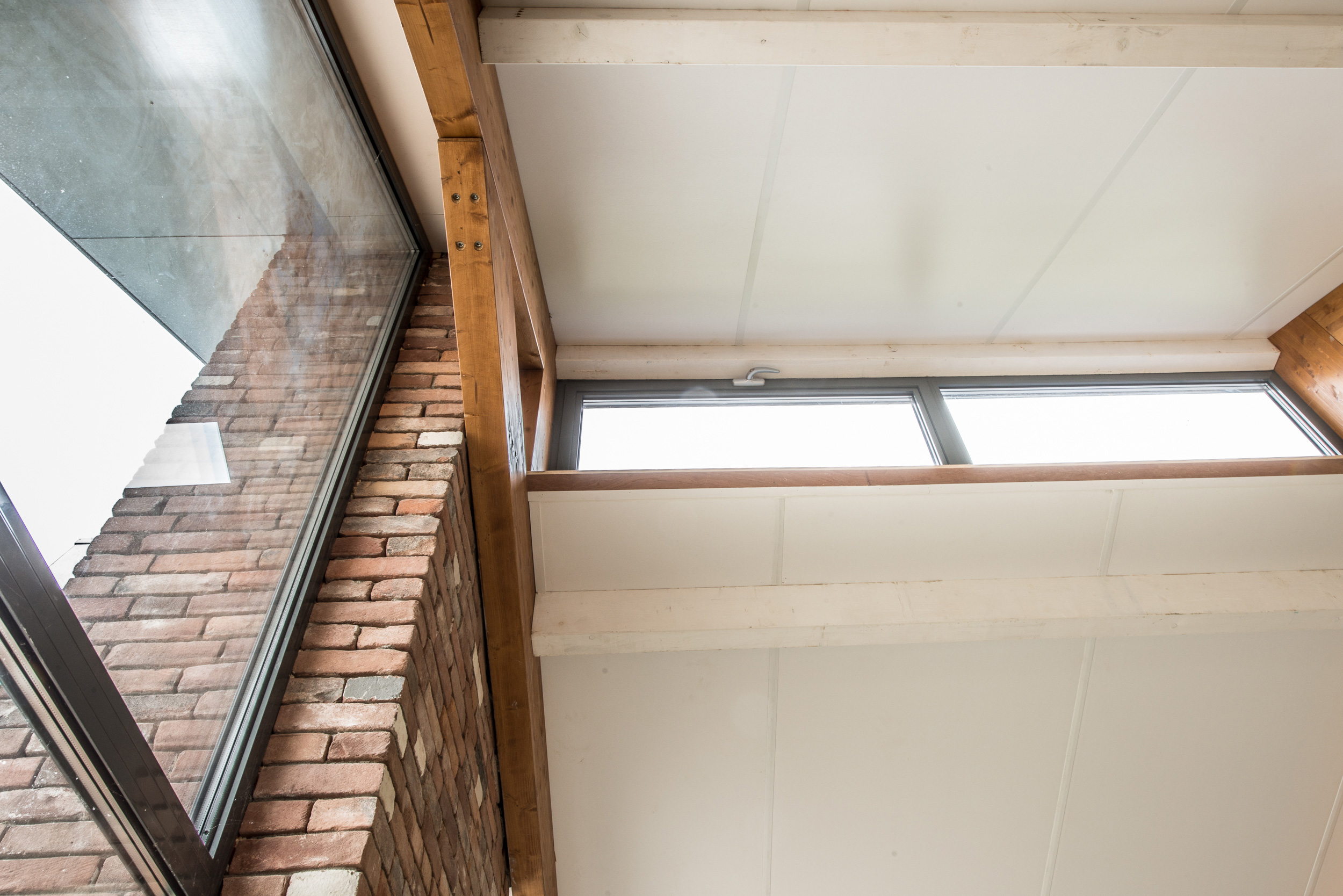 Op de verdieping is de noordzijde uitgebouwd tov. de zuidzijde om zodoende te kunnen profiteren van de zonnewarmte. Door dit bouwdeel af te werken met één bekledingsmateriaal ontstaat het beeld van omhulling of capuchon.